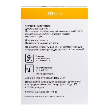 Инсулин короткого действия. Представляет собой инсулин человека, полученный с использованием технологии рекомбинантной ДНК.