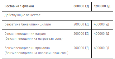 Содержание натрия в разовой дозе препарата для дозировки 600000 ЕД — 7,73 мг или 0,336 ммоль, для дозировки 1200000 ЕД — 15,46 мг или 0,672 ммоль.