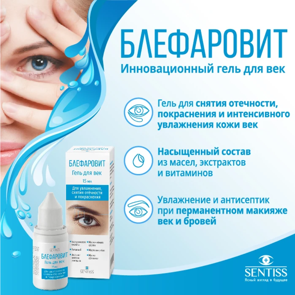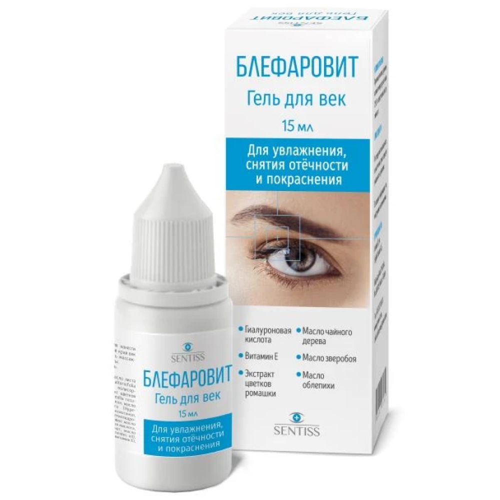 Гель для увлажнения, снятия отечности и покраснения глаз. Масло листьев чайного дерева в комбинации с токоферолом, которые входят в состав геля Блефаровит, обеспечивают мягкость и эластичность кожи век и помогают в устранении отечности и признаков дискомфорта. Масло чайного дерева может оказывать антисептическое действие в т.ч. против клеща Demodex folliculorum. Токоферол играет роль в восстановлении кожи и слизистых оболочек. Ромашка оказывает противомикробное и противовоспалительное действие, облепиха обладает ранозаживляющим и противовоспалительным действием. Гиалуроновая кислота (в виде натрия гиалуроната) наделена свойством притягивать и удерживать (связывать) воду, тем самым обеспечивая увлажнение, упругость кожи. Благодаря комплексному действию компонентов, входящих в состав геля Блефаровит, его можно использовать при различных дискомфортных состояниях кожи век, ресниц и бровей, таких как шелушение, сухость, раздражение, а также при воспалительном состоянии и покраснении век.