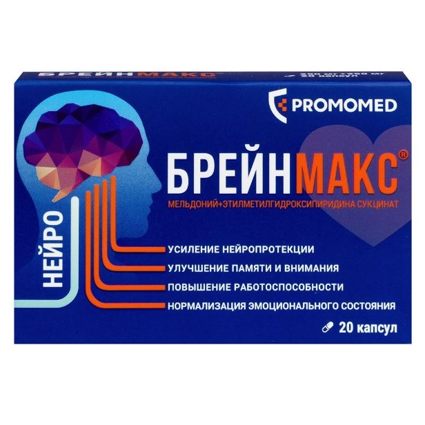 Применение комплекса триметилгидразиния пропионата и этилметилгидроксипиридина сукцината приводит к синергическому фармакодинамическому взаимодействию двух компонентов по типу конформационно-селективного агонизма к рецепторам, что повышает нейропротекторную активность препарата. В условиях гипоксии препарат БРЕЙНМАКС® приводит к активации выработки энергии в митохондриях, а в условиях снижения кровоснабжения способствует сохранению структуры и жизнедеятельности клеток, в частности нейронов и кардиомиоцитов.