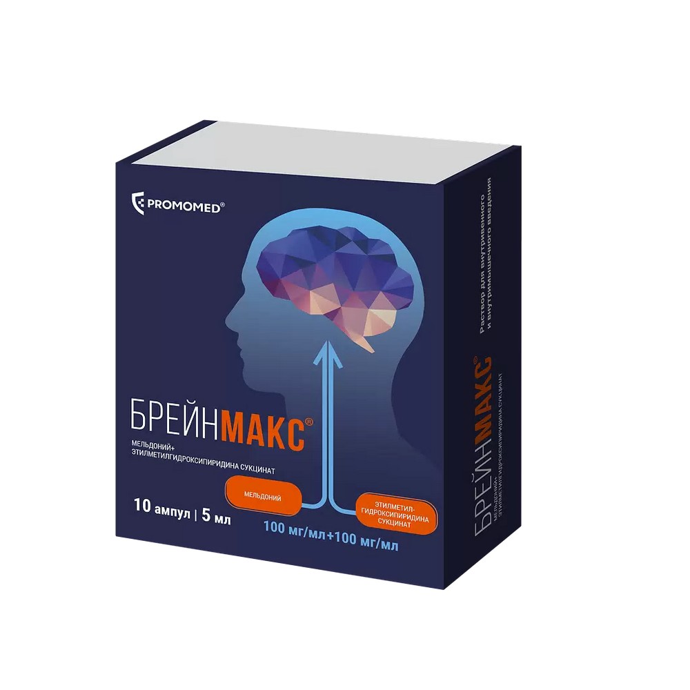 Совместное применение мельдония и этилметилгидроксипиридина сукцината приводит к синергическому фармакодинамическому взаимодействию двух компонентов, что повышает нейропротекторную активность препарата. При применении комбинированного лекарственного препарата БРЕИНМАКС® оказываемый противогипоксический, антиоксидантный, ноотропный и противоишемический эффект двух действующих веществ превосходит фармакологический эффект каждого из компонентов, применяемых в отдельности, что приводит к уменьшению клинических проявлений цереброваскулярной недостаточности, улучшению когнитивных функций, улучшению памяти и внимания, нормализации эмоционального состояния, уменьшению симптомов психического и физического перенапряжения, повышению работоспособности, увеличению толерантности к умственным и физическим нагрузкам.