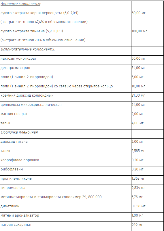 Повышенная чувствительность к компонентам препарата (в том числе к первоцвету и тимьяну, а также к другим растениям рода первоцвет и/или семейства губоцветные); заболевания желудочно-кишечного тракта (в стадии обострения); непереносимость лактозы, дефицит лактазы, глюкозо-галактозная мальабсорбция (из-за содержания в препарате лактозы моногидрата и декстрозы сиропа), детский возраст до 12 лет в связи с отсутствием клинических данных.