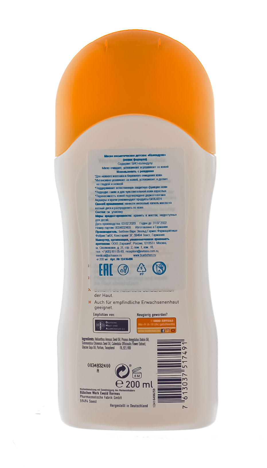 Масло содержит чистые растительные масла, успокаивает и мягко ухаживает за сухой кожей, поэтому оно идеально подходит для очищения кожи в области подгузника, а так же для расслабляющего массажа для младенцев и взрослых. Содержит БИО-календулу, миндальное масло и масло подсолнечника. Чистые растительные масла увлажняют и питают сухую кожу. Не содержит минерального масла, красителей и консервантов. Использовать с рождения.