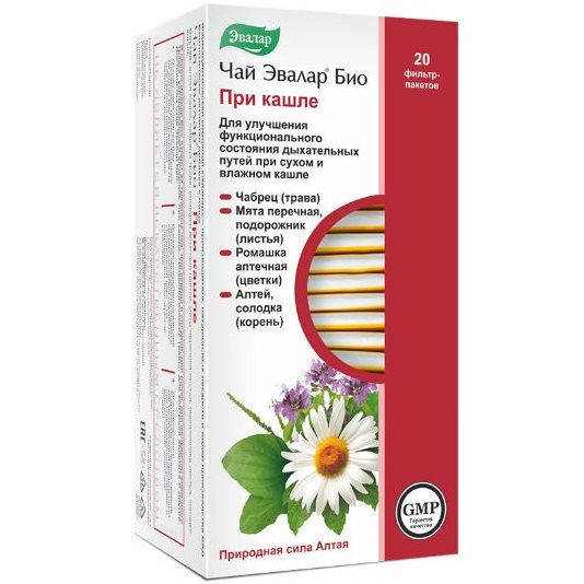 В составе букет ароматных трав: обладающие мягким ароматом цветки ромашки и корни девясила, сладкие тимоловые нотки травы душицы и чабреца, легкая пряная горчинка цветков календулы и листьев подорожника, которые помогут справиться с кашлем. Как работают ингредиенты Подорожник большой обладает противовоспалительным, ранозаживляющим, антисептическим, бактериостатическим, кровоостанавливающим, противоаллергическим, обезболивающим, отхаркивающим свойствами. Благодаря наличию слизи в растении, настой из листьев способствует разжижению, растворению и выведению густой мокроты при кашле. Подорожник защищает эпителий дыхательных путей, способствует нормализации свойств сурфактанта дыхательных путей и восстановлению реснитчатого эпителия. А наличие фитонцидов в растении обусловливает антимикробное действие 1,2. Ромашка аптечная является природным лечебным средством, эффективным при всех заболеваниях слизистых оболочек. Ее целесообразно использовать во всех возрастах – от детского до старческого, при лечении болезней кожи, полости рта, зева, бронхов и желудочно-кишечного тракта. Кроме того, ромашка оказывает противовоспалительное, антисептическое, потогонное, обезболивающее спазмолитическое действие на гладкую мускулатуру 2-4. Цветки календулы лекарственной обладают противовоспалительным, антимикробным и ранозаживляющим действием 2,3. Трава душицы - настой из неё рекомендуется принимать как отхаркивающее, муколитическое, болеутоляющее, успокаивающее, противовоспалительное, антимикробное средство 3,5. Корень девясила обладает отхаркивающим, антисептическим и противовоспалительным свойствами.
