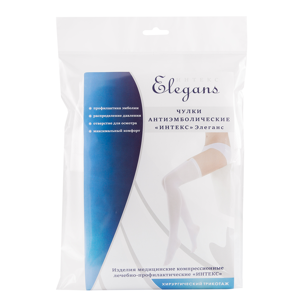 Антиэмболические чулки Элеганс от компании Интекс 2 степени компрессии имеют в стопной части специальное отверстие. Оно предназначено для наблюдения за состоянием кровообращения во время операции и выполнения гигиенических процедур во время постельного режима. Чулки для операции (они же, чулки для родов) выпускаются белого цвета по медицинским и санитарно-гигиеническим требованиям.