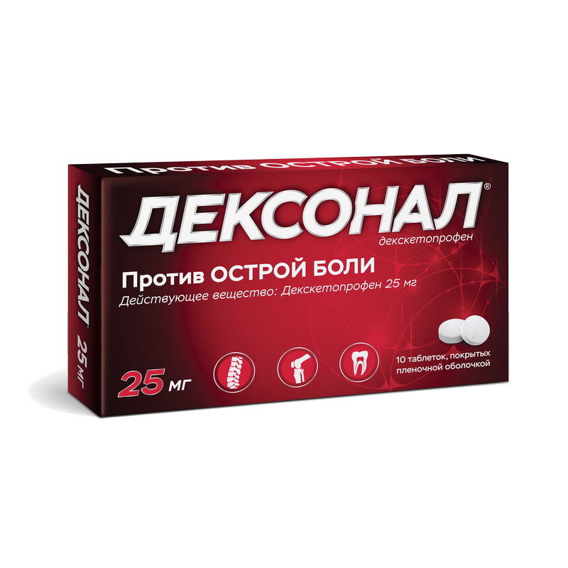 Декскетопрофена трометамол, действующее вещество препарата Дексонал®, относится к НПВП, оказывающим обезболивающее, противовоспалительное и жаропонижающее действие. Механизм действия декскетопрофена основан на ингибировании синтеза простагландинов на уровне циклооксигеназ (ЦОГ-1 и ЦОГ-2).
