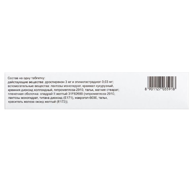 Действующие вещества: дроспиренон 3 мг, этинилэстрадиол 0,03 мг;