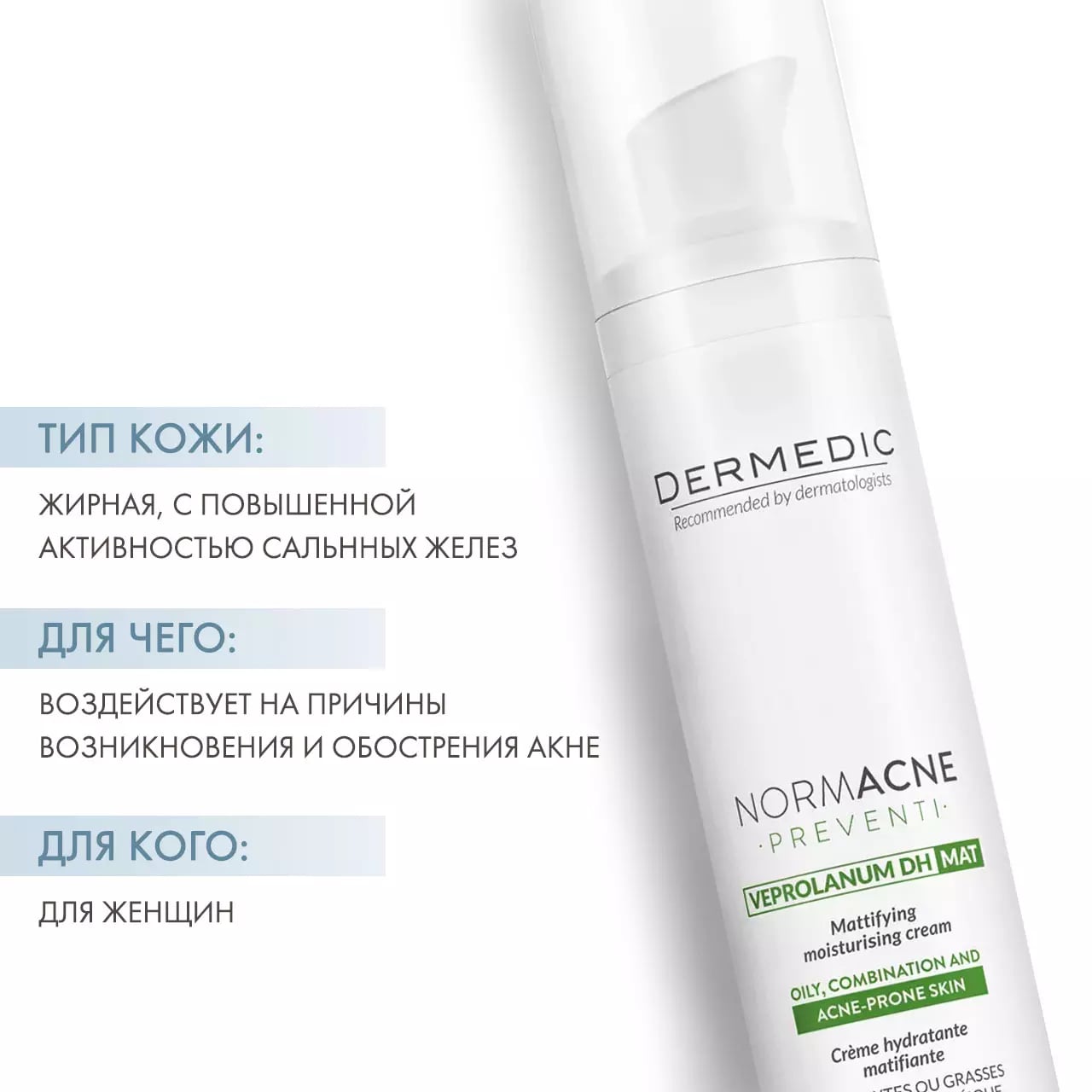 Увлажняющий крем обеспечивает длительный матирующий эффект. Действует на причины возникновения и обострения акне.