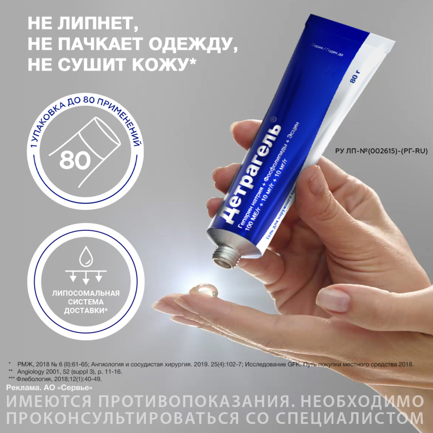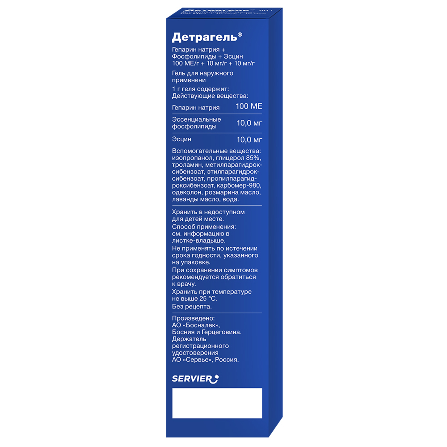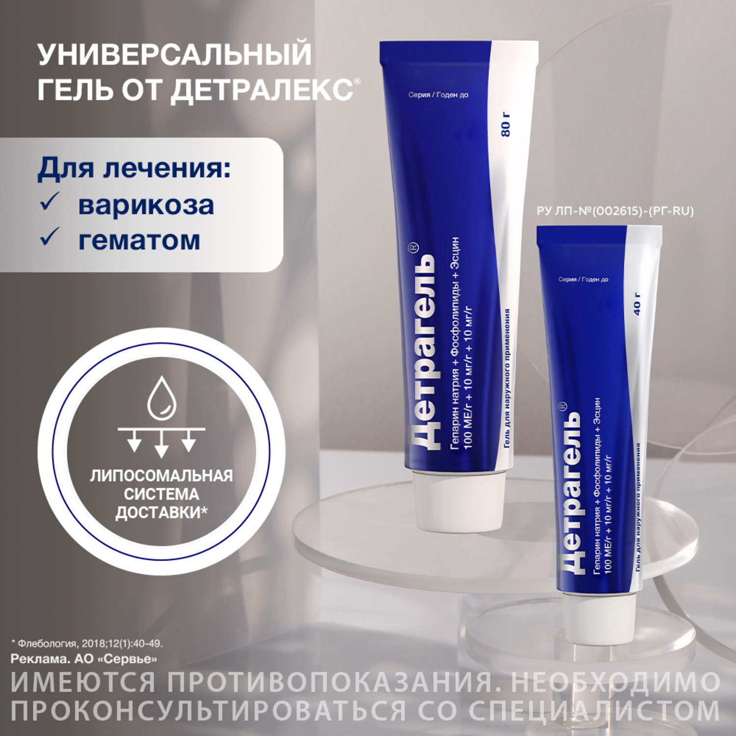 Комбинированный препарат, оказывает местное антикоагулянтное, противовоспалительное, венотонизирующее и антиагрегантное действие, снижает проницаемость вен, улучшает микроциркуляцию. Детрагель® содержит три действующих вещества: гепарин натрия, эссенциальные фосфолипиды и эсцин, которые обладают фармакодинамическим и фармакокинетическим синергизмом.