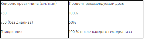 Пациенты, находящиеся на гемодиализе, должны получать 100% рекомендуемой дозы после каждого сеанса диализа. В день, когда диализ не проводится, пациенты должны получать уменьшенную (в зависимости от клиренса креатинина) дозу препарата.