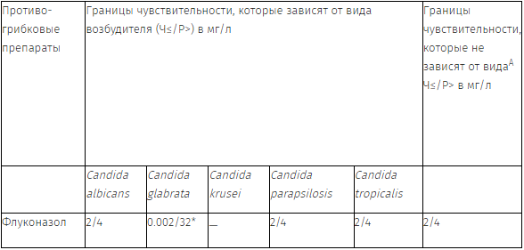 Основываясь на анализе фармакокинетических/фармакодинамических (ФК/ФД) данных, чувствительности in vitro и клиническом ответе, EUCAST-AFST (Европейский комитет по определению чувствительности микроорганизмов к антимикробным препаратам подкомитет по определению чувствительности к противогрибковым препаратам) определил границы чувствительности к флуконазолу для видов Candida (документ «EUCAST Fluconazole rational document (2013 г.)» — редакция 2; Европейский комитет по определению чувствительности микроорганизмов к антимикробным препаратам подкомитет по определению чувствительности к противогрибковым препаратам, (документ «Таблицы пограничных значений чувствительности для интерпретации значений МИК (2018-02-12)» - редакция 9.0). Пограничные значения были разделены на не относящиеся к видам, которые были определены преимущественно на основании данных ФК/ФД и не зависят от распределения МИК для конкретных видов, и связанные с видами, которые наиболее часто вызывают инфекции у людей. Эти пограничные значения представлены в таблице ниже.