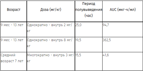 При однократном приеме изменения дозы не требуется. У пациентов (включая детей) с нарушением функции почек при многократном применении препарата следует первоначально ввести ударную дозу от 50 мг до 400 мг, после чего суточную дозу (в зависимости от показания) устанавливают согласно следующей таблице: