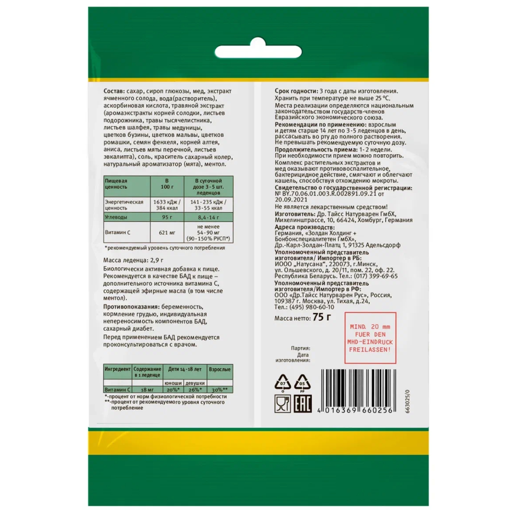 Инструкция по применению Доктор Тайсс 75 г леденцы от кашля пакет витамин С швейцарские травы и мёд