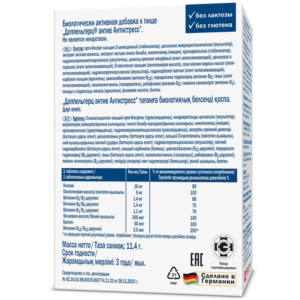 Пантотенат кальция (пантотеновая кислота) – играет важную роль в борьбе организма со стрессовыми ситуациями. Поддерживает нормальную жизнедеятельность организма, находящегося в состоянии напряжения, слабости и усталости. Способствует снятию физической усталости и стресса, важен для правильного функционирования нервной системы.