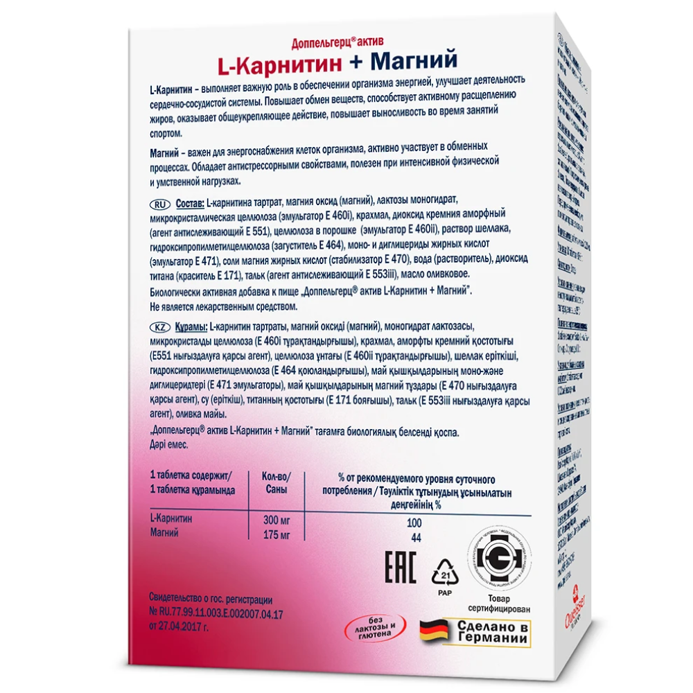 Доппельгерц® актив L-карнитин+Магний обеспечивает сердце и весь организм важными питательными веществами для жирового и энергетического обмена, особенно при интенсивных физических нагрузках (например, при занятиях спортом и для повышения выносливости) или в стрессовых ситуациях.
