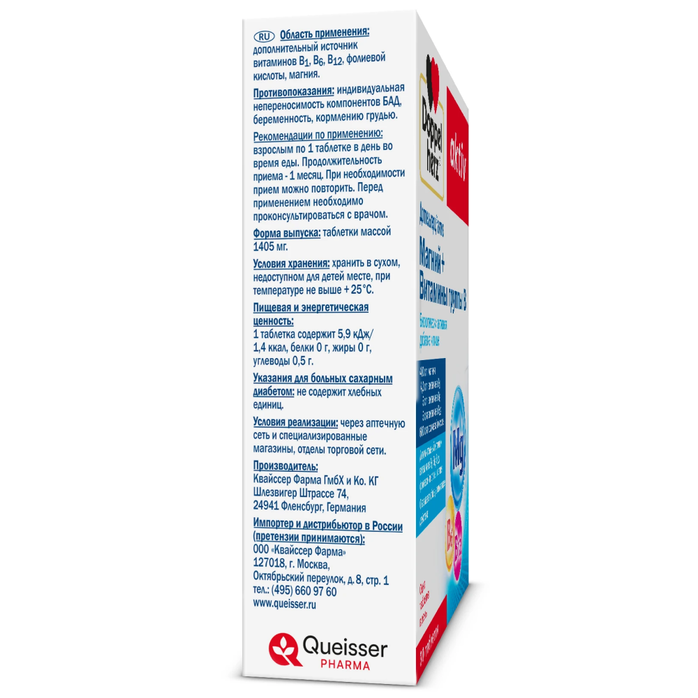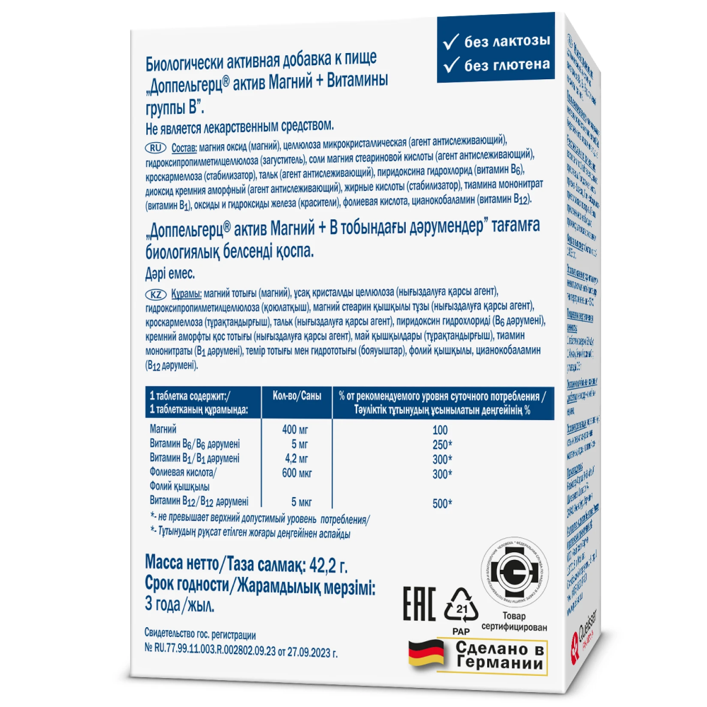Доппельгерц Актив Магний + Витамины группы В - снабжает организм важными питательными веществами при повышенных нервных и физических нагрузках, способствует улучшению самочувствия.