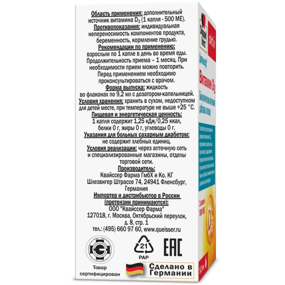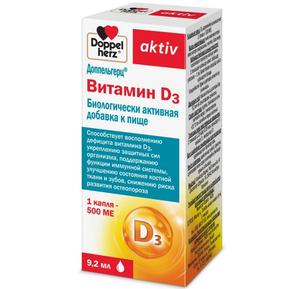 Биологически активная добавка к пище "Витамин D3" товарного знака "Доппельгерц". Дополнительный источник витамина D3 (1 капля - 500 МЕ).