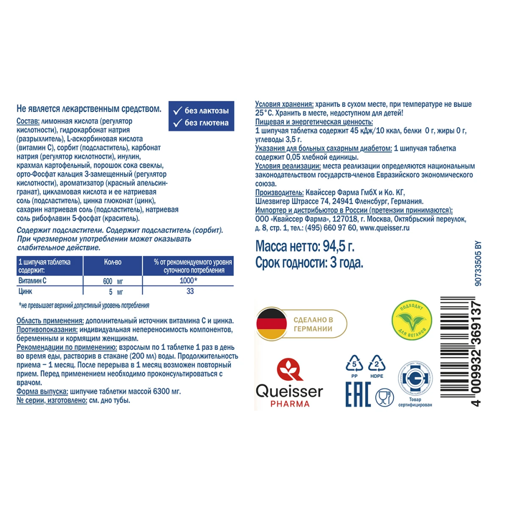 Лимонная кислота (регулятор кислотности Е 330), гидрокарбонат натрия (разрыхлитель Е 500ii), аскорбиновая кислота (витамин С), сорбит (подсластитель Е 420i), карбонат натрия (регулятор кислотности Е 500i), инулин, крахмал загуститель), порошок сока свеклы, орто-Фосфат кальция 3-замещенный (регулятор кислотности Е 341iii), ароматизатор (красный апельсин-гранат), цикламовая кислота и ее натриевая соль (подсластитель Е 952), цинка глюконат (цинк), сахарин натриевая соль (подсластитель Е 954), натриевая соль рибофлавин 5-фосфат (краситель Е 101ii).