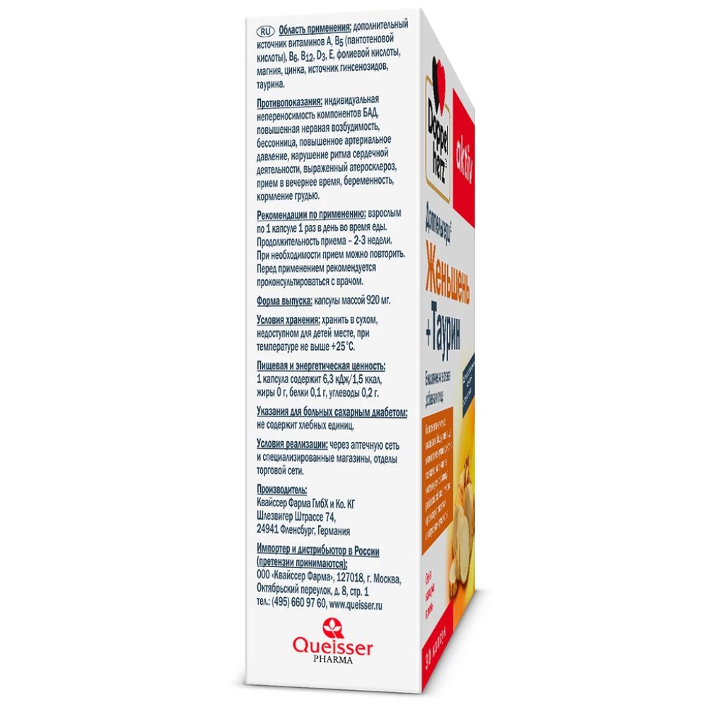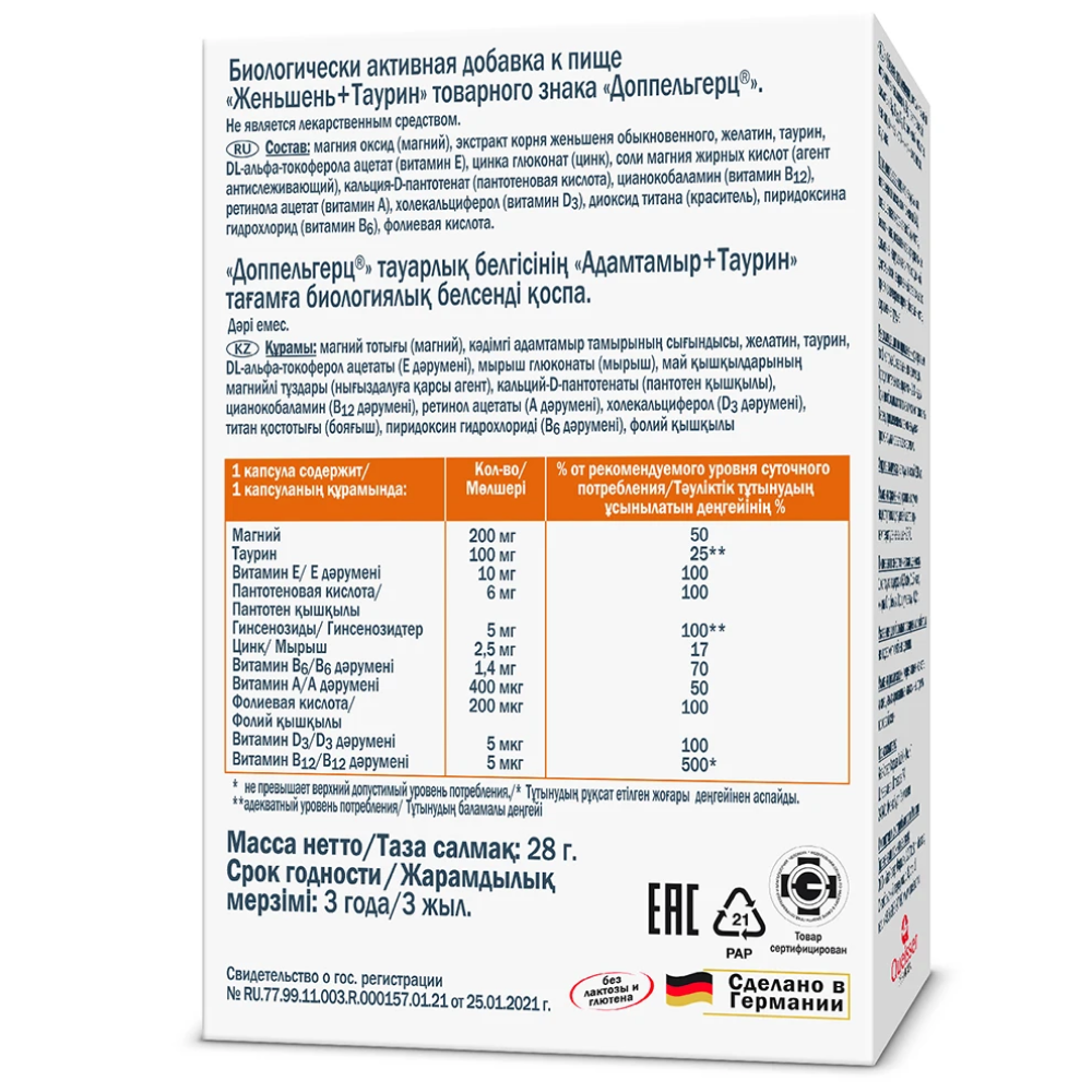 Магния оксид (магний), экстракт корня женьшеня обыкновенного, желатин, таурин, DL-альфа-токоферола ацетат (витамин Е), цинка глюконат (цинк), соли магния жирных кислот (агент антислеживающий), кальция-D-пантотенат (пантотеновая кислота), цианокобаламин (витамин В12), ретинола ацетат (витамин А), холекальциферол (витамин D3), диоксид титана (краситель), пиридоксина гидрохлорид (витамин В6), фолиевая кислота.