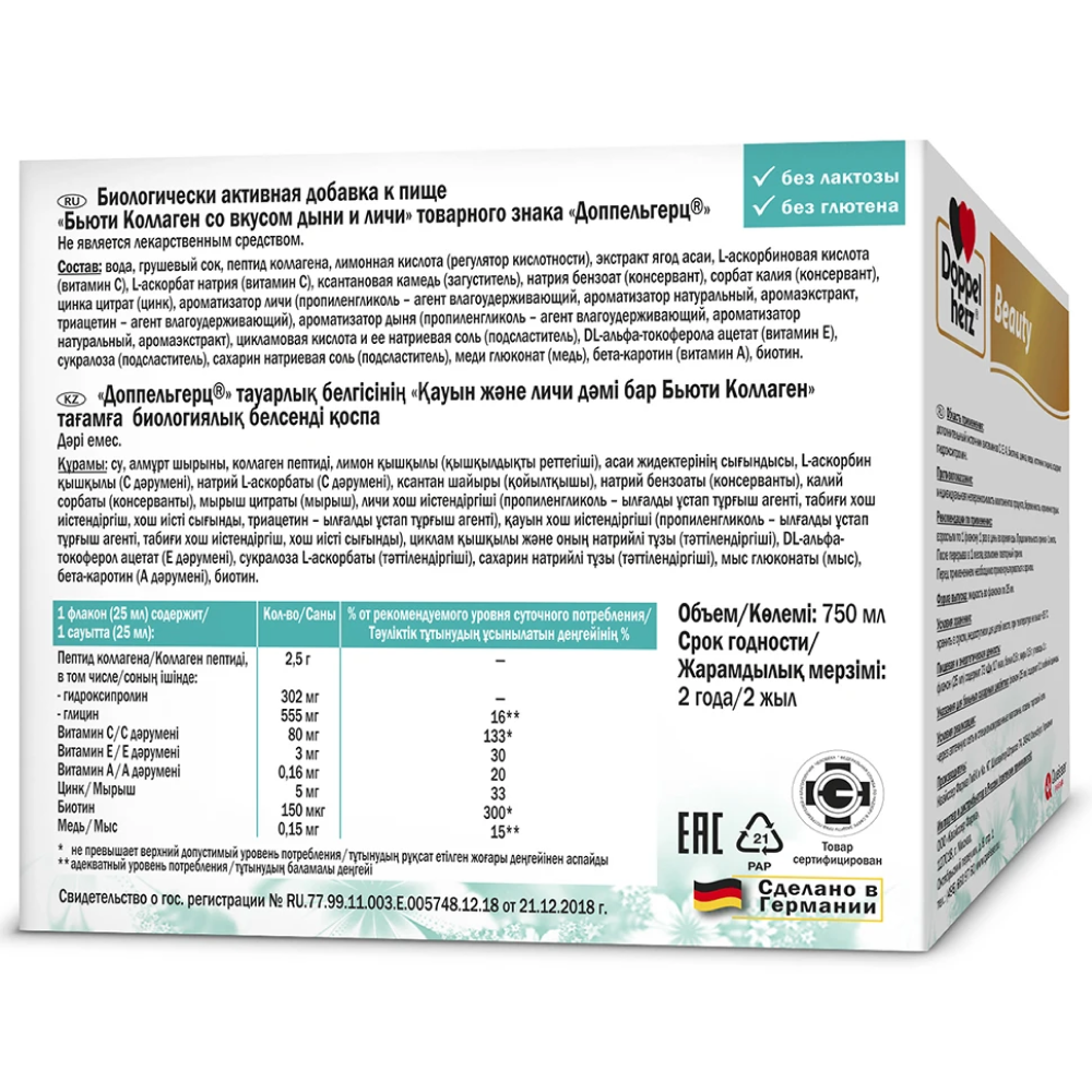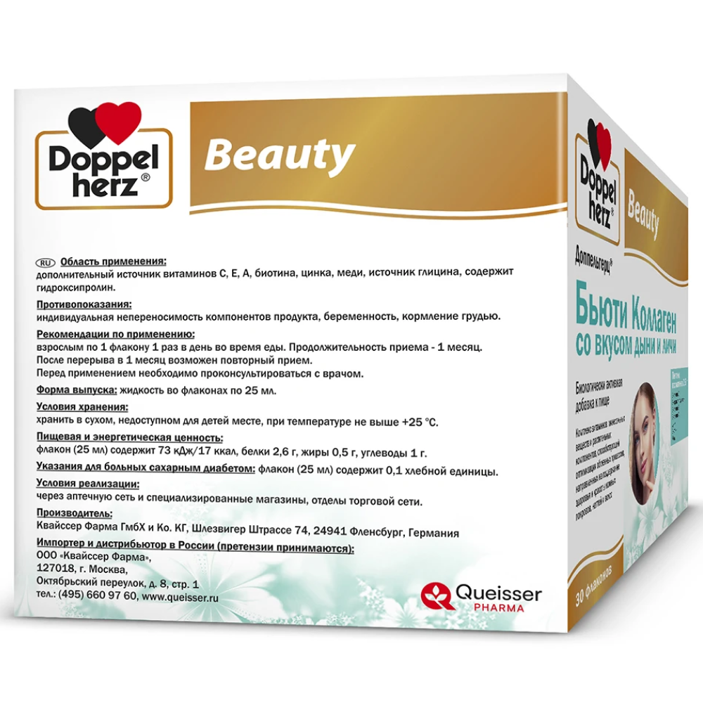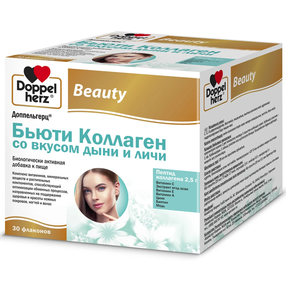Доппельгерц Бьюти Коллаген со вкусом дыни и личи в питьевых флаконах содержит пептиды коллагена для Вашей красоты, специально подобранный комплекс витаминов и микроэлементов и экстракт ягод асаи.