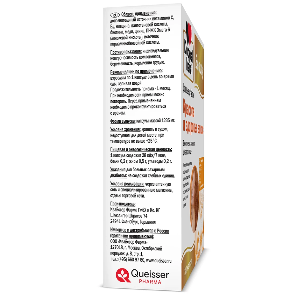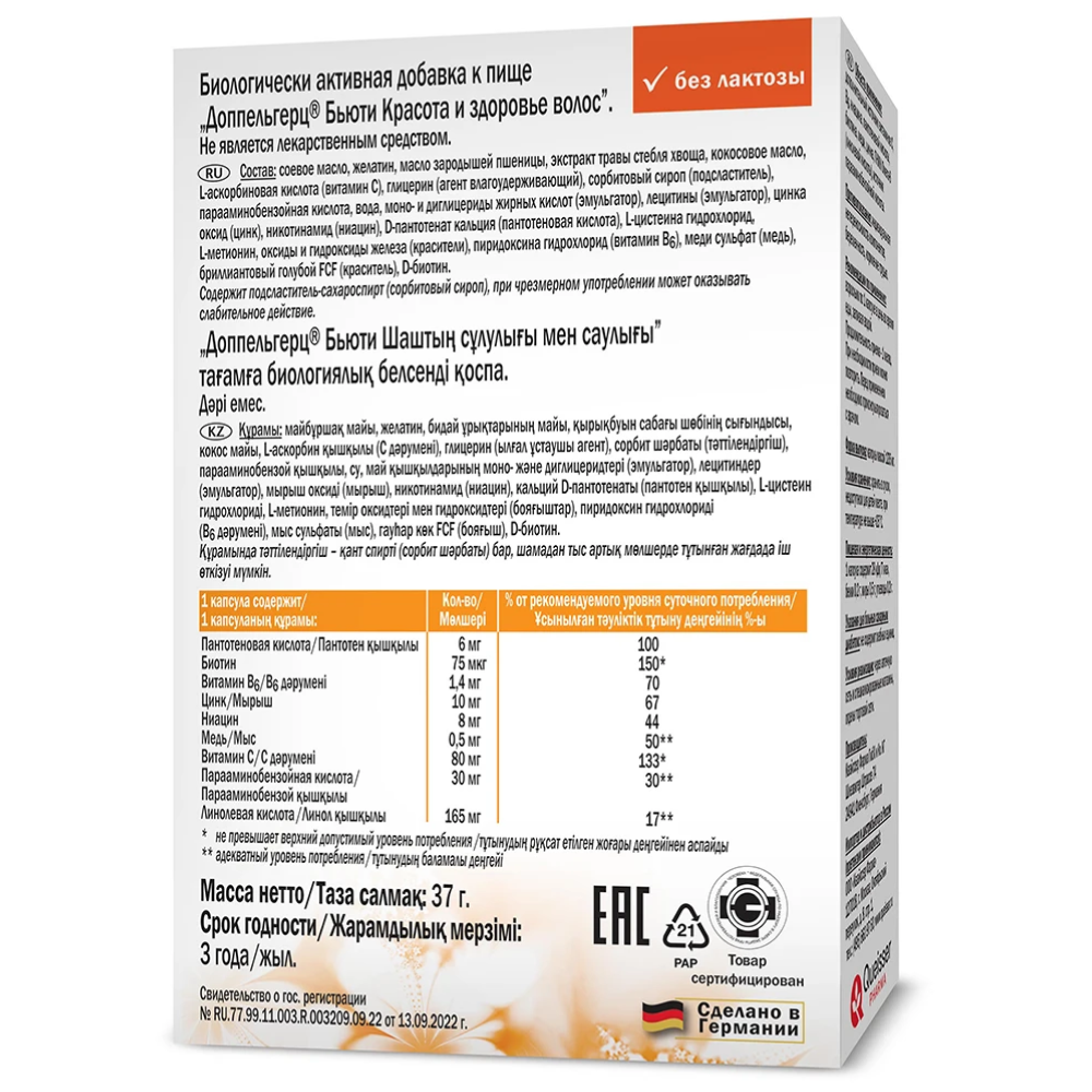 Активные вещества: масло зародышей пшеницы, сухой экстракт хвоща, витамин С, сухой экстракт сорго (просо), аминобензойная кислота, цинка оксид, никотинамид (витамин РР), цистеина гидрохлорид моногидрат, кальция D-пантотенат, метионин, пиридоксина гидрохлорид (витамин В6), меди сульфат моногидрат, биотин.