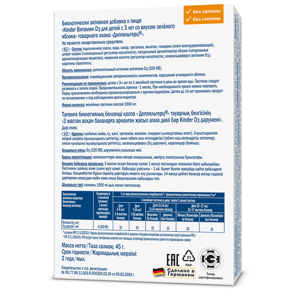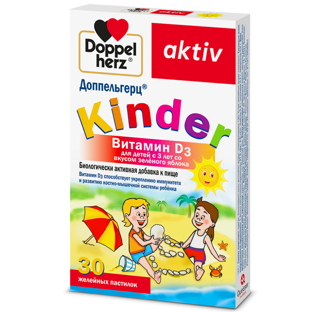 Инструкция по применению Доппельгерц Киндер Витамин Д3 30 шт пастилки жевательные для детей с 3 лет зеленое яблоко
