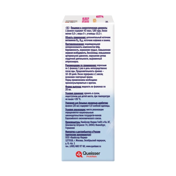Пищевая и энергетическая ценность: 1 флакон содержит 43 ккал / 180 кДж, белки менее 0,5 г, жи-ры 0 г, углеводы 10,3 г.