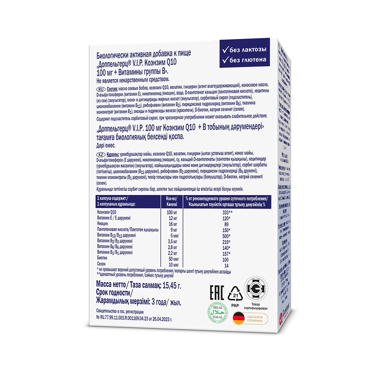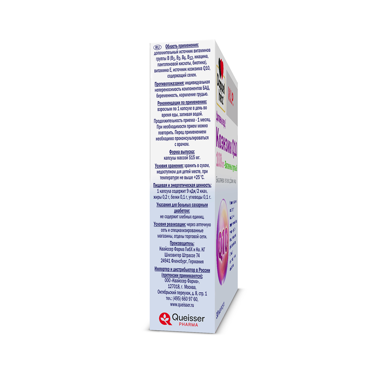 Масло соевых бобов, коэнзим Q10, желатин, глицерин (агент влагоудерживающий), кокосовое масло, D-альфа-токоферол (витамин Е), никотинамид (ниацин), вода, D-пантотенат кальция (пантотеновая кислота), лецитины (из сои) (эмульгатор), моно- и диглицериды кислот (эмульгатор), сорбитовый сироп (подсластитель), цианокобаламин (витамин В12), рибофлавин (витамин В2), пиридоксина гидрохлорид (витамин В6), тиамина мононитрат (витамин В1), оксиды и гидроксиды железа (красители), D-биотин, натрия селенит (селен).