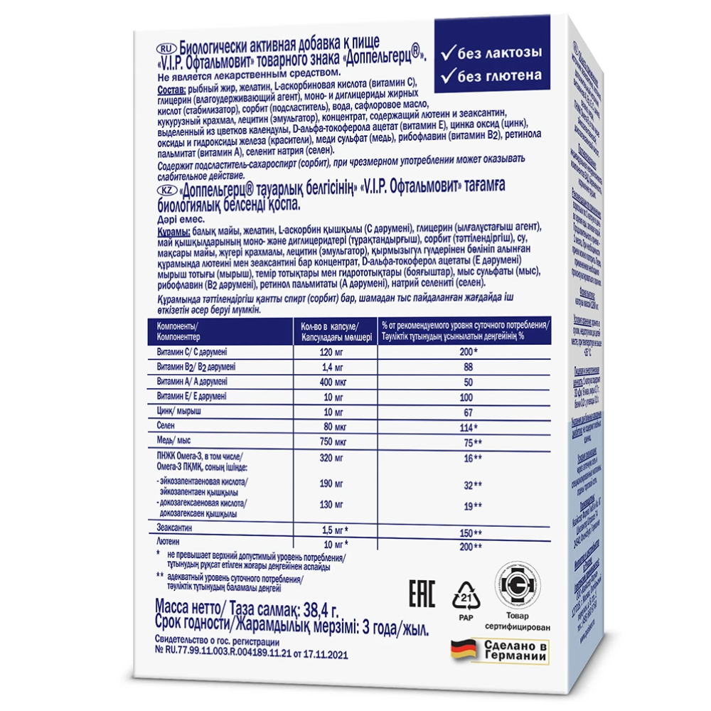 «Доппельгерц® V.I.P. ОфтальмоВит» содержит лютеин, зеаксантин, а также витамины, микроэлементы и ПНЖК Омега-3 для поддержания оптимального функционирования слезной пленки.