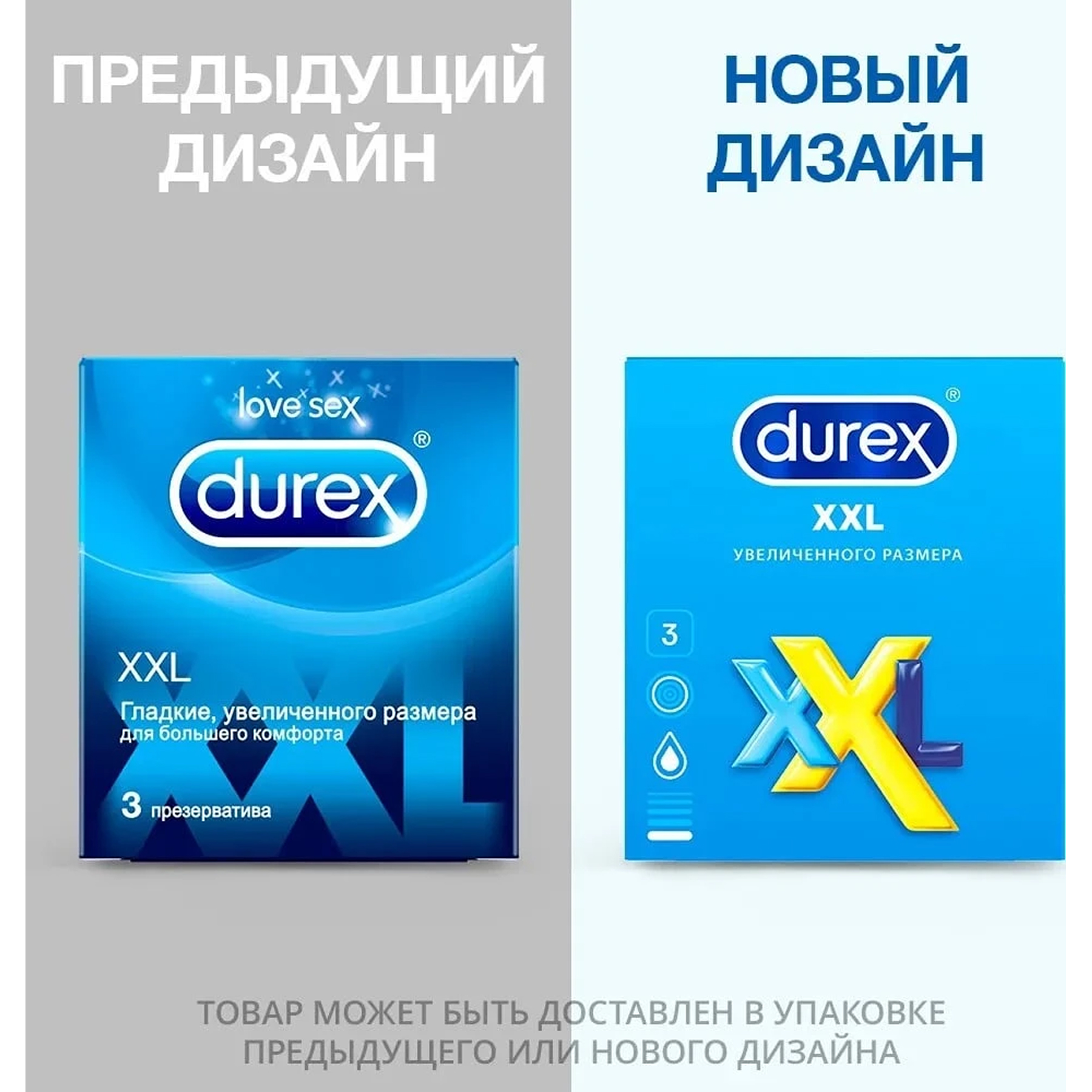 Durex XXL – это презерватив размера XXL для тех, кто не хочет чувствовать стеснения. Durex XXL - самые большие презервативы в линейке Durex, обеспечивающие больший комфорт тем, кому это необходимо. Благодаря особой технологии  производства не имеет неприятного запаха. Все предусмотрено для того, чтобы вы могли расслабиться и наслаждаться безопасным сексом.  Гладкие, бесцветные, из натурального латекса, с гелем-смазкой. Номинальные размеры: длина – 220 мм, ширина – 56 мм. Дерматологически тестированы. 100% проверены электроникой. Ни один из методов контрацепции не может гарантировать 100% защиты от нежелательной беременности, ВИЧ, или иных заболеваний, передающихся половым путем.