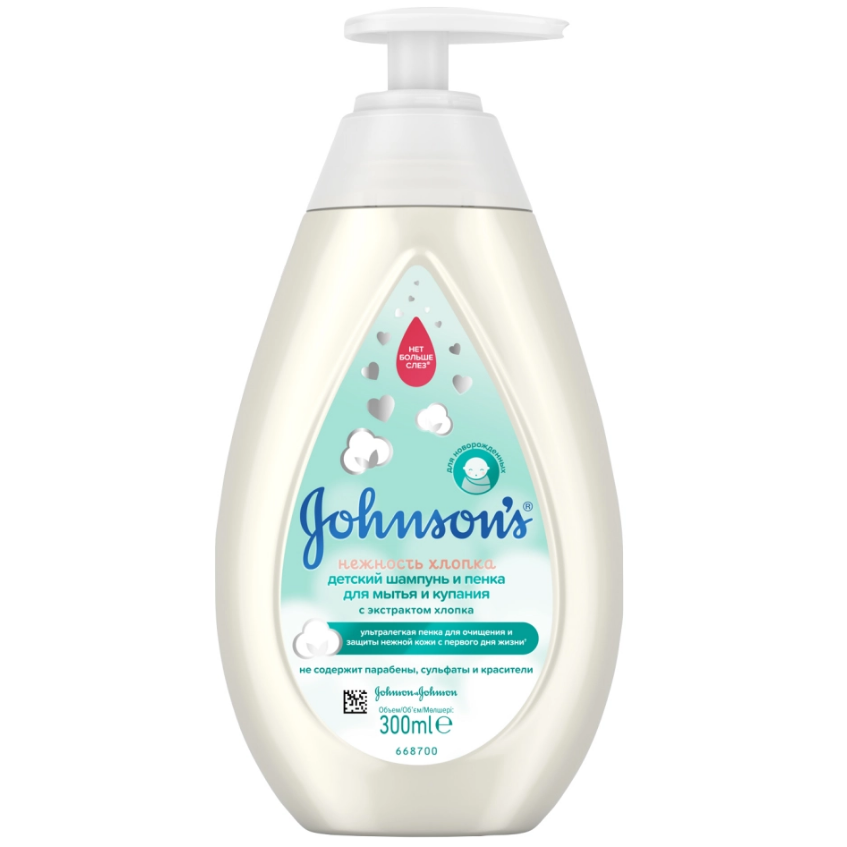 Детский шампунь и пенка Johnson's Baby для мытья и купания Нежность хлопка имеет сбалансированный уровень pH, который подходит для чувствительной кожи новорожденных. Благодаря легкой и нежной текстуре этот шампунь и пенка подходит для новорожденных с первых дней жизни. Он отлично очищает кожу и волосы и полностью смывается с кожи ребенка.