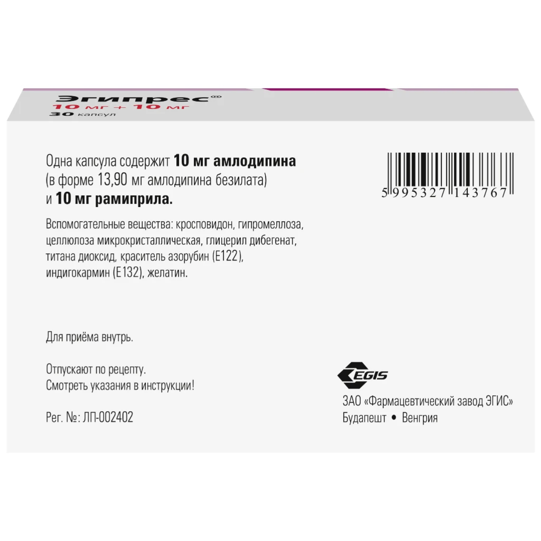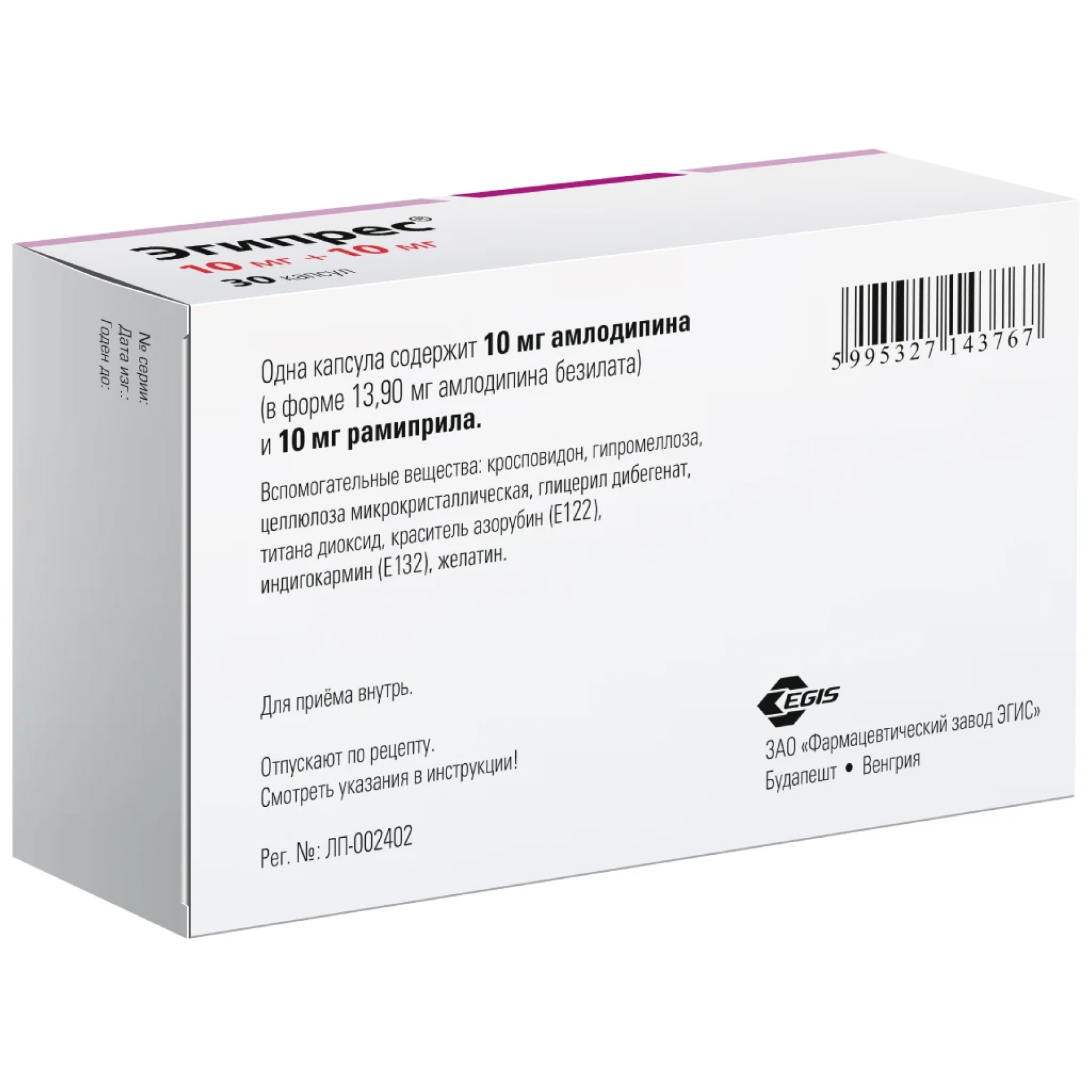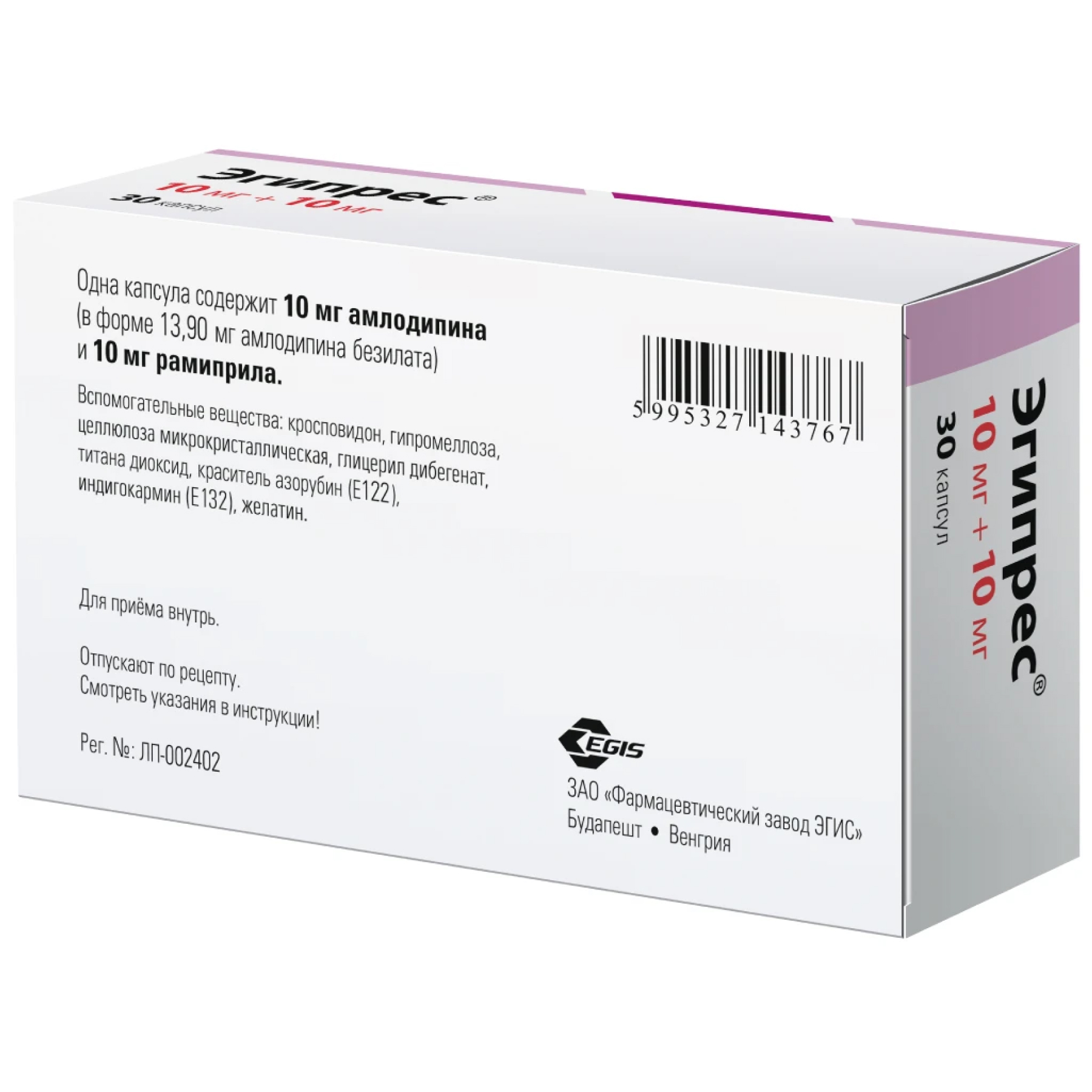 При терапевтической необходимости доза препарата Эгипрес® может быть изменена на основании индивидуального титрования доз отдельных компонентов: 5 мг амлодипина + 5 мг рамиприла или 5 мг амлодипина + 10 мг рамиприла или 10 мг амлодипина + 5 мг рамиприла или 10 мг амлодипина + 10 мг рамиприла.
