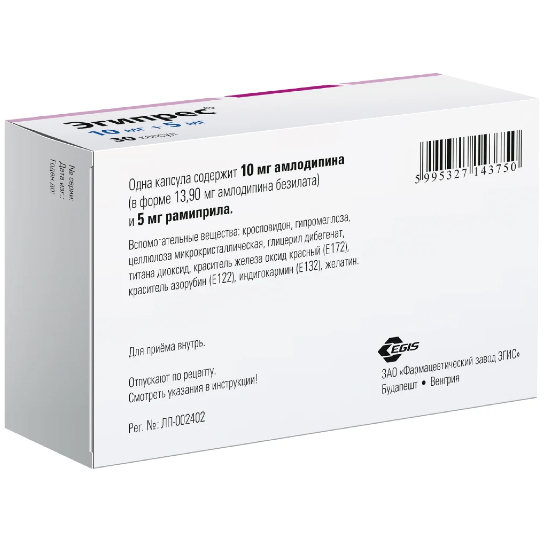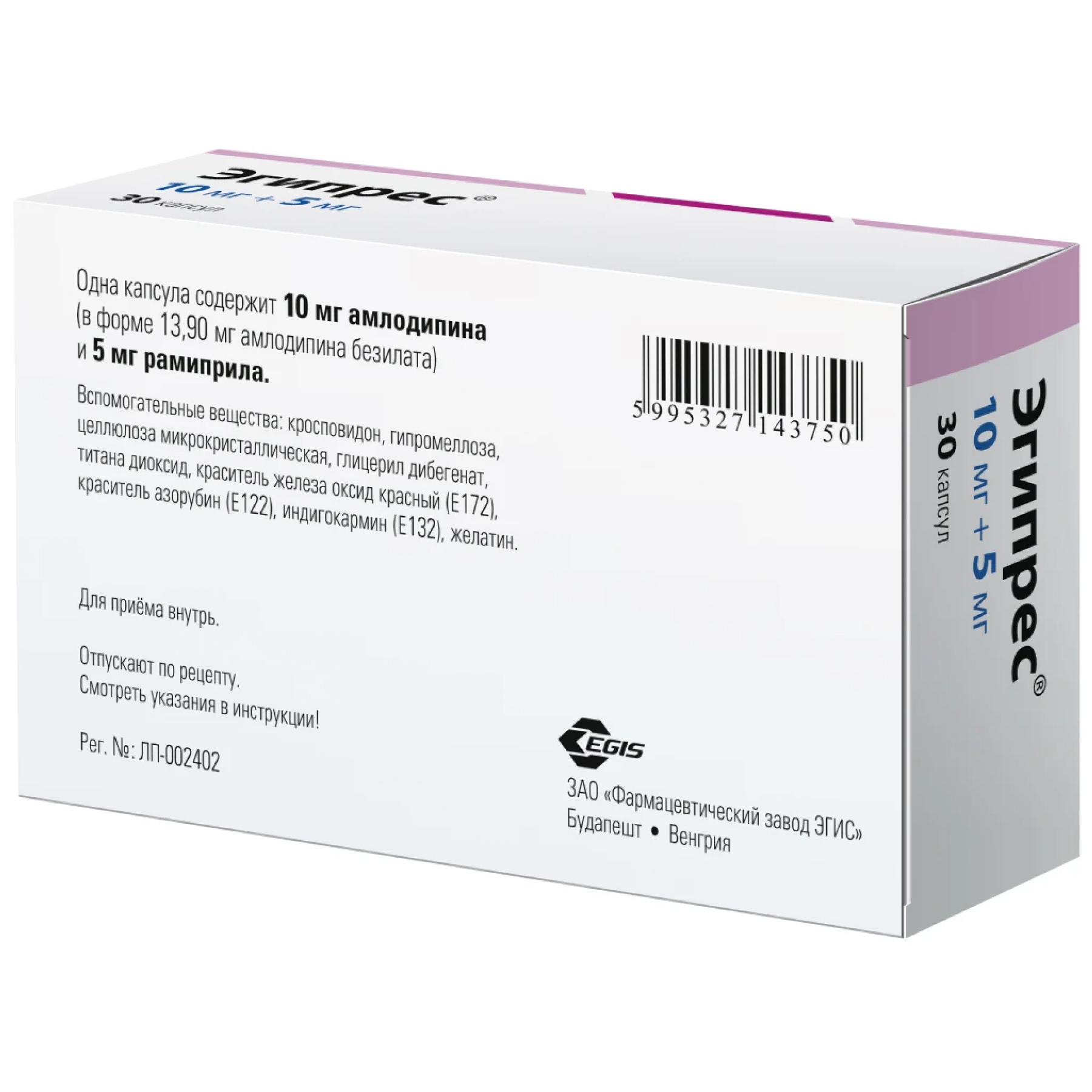 При терапевтической необходимости доза препарата Эгипрес® может быть изменена на основании индивидуального титрования доз отдельных компонентов: 5 мг амлодипина + 5 мг рамиприла или 5 мг амлодипина + 10 мг рамиприла или 10 мг амлодипина + 5 мг рамиприла или 10 мг амлодипина + 10 мг рамиприла.