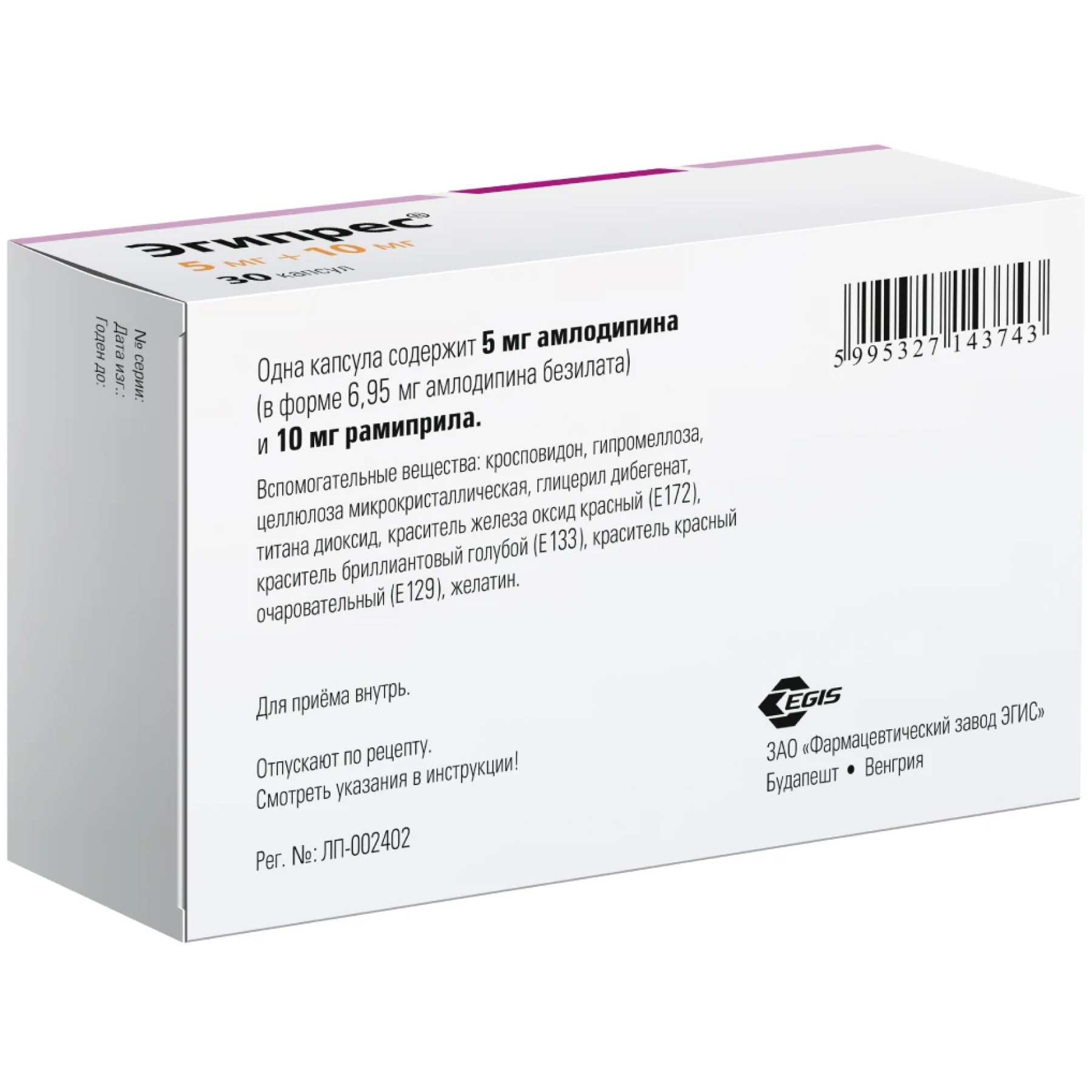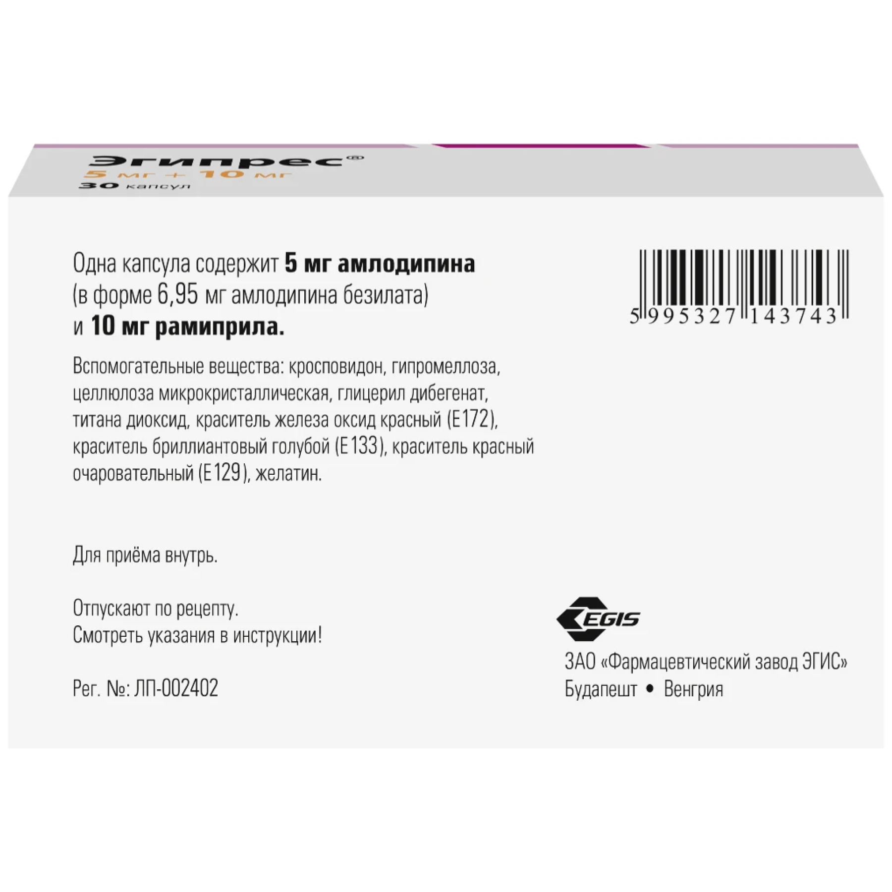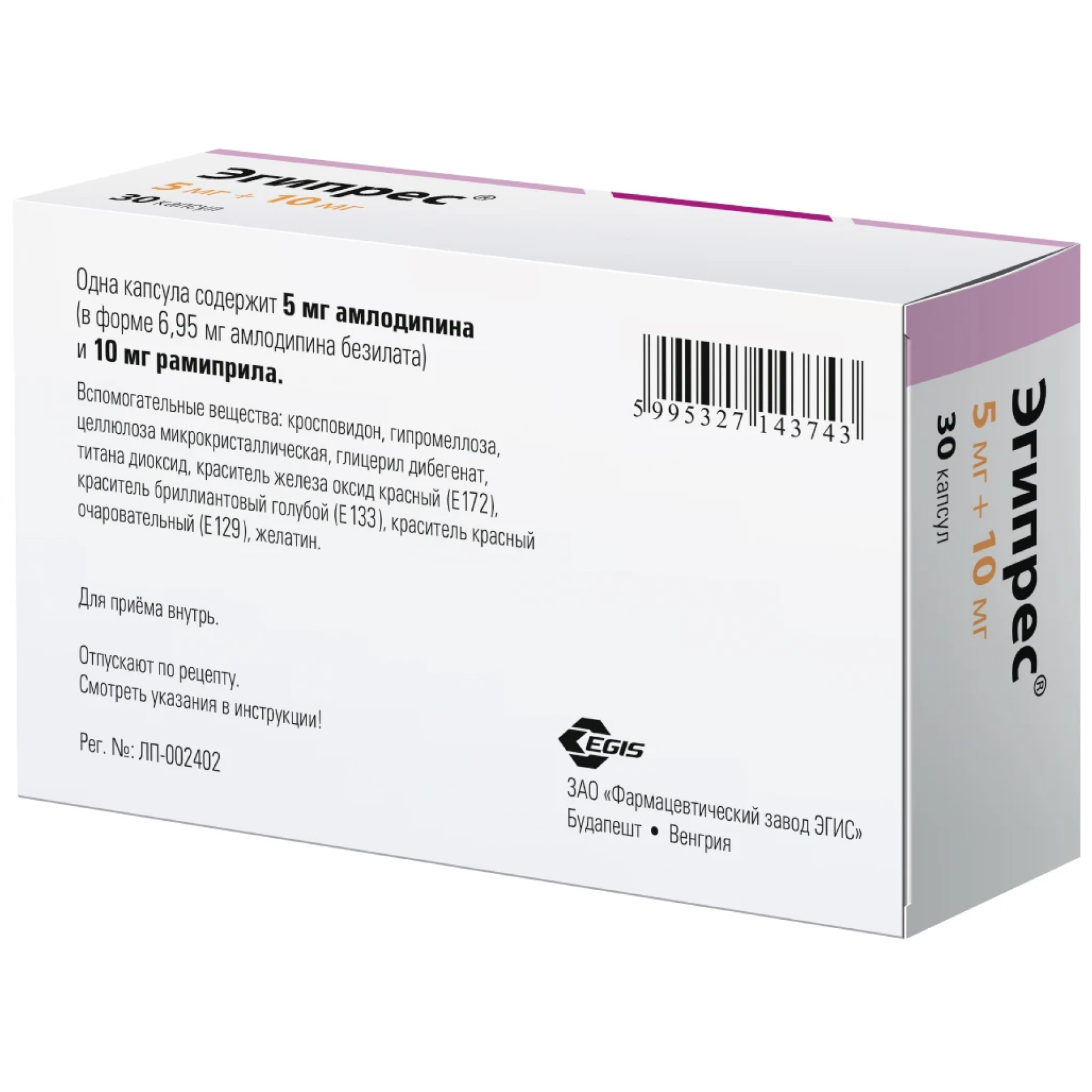 При терапевтической необходимости доза препарата Эгипрес® может быть изменена на основании индивидуального титрования доз отдельных компонентов: 5 мг амлодипина + 5 мг рамиприла или 5 мг амлодипина + 10 мг рамиприла или 10 мг амлодипина + 5 мг рамиприла или 10 мг амлодипина + 10 мг рамиприла.