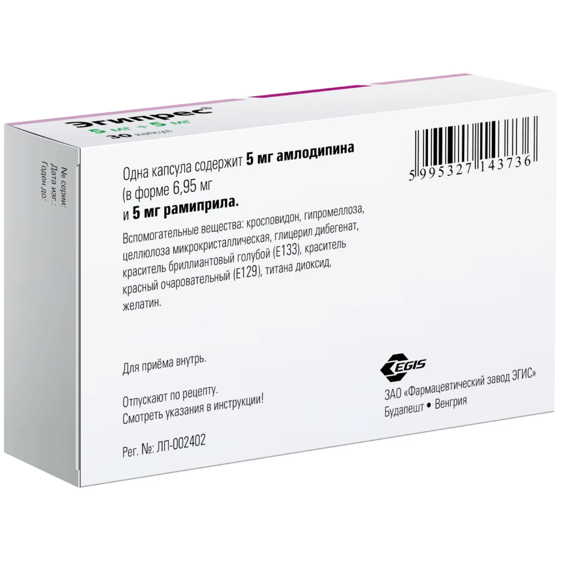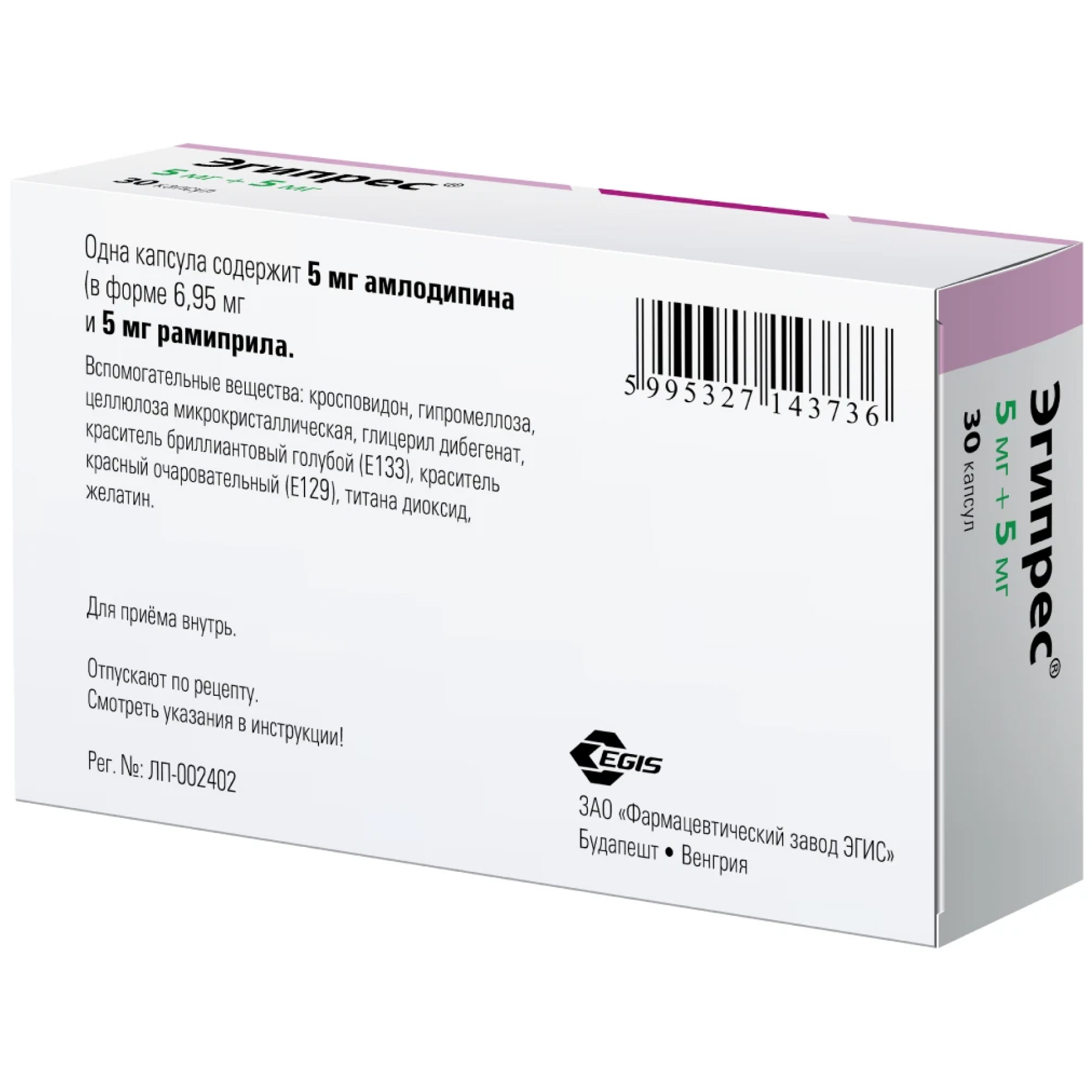 При терапевтической необходимости доза препарата Эгипрес® может быть изменена на основании индивидуального титрования доз отдельных компонентов: 5 мг амлодипина + 5 мг рамиприла или 5 мг амлодипина + 10 мг рамиприла или 10 мг амлодипина + 5 мг рамиприла или 10 мг амлодипина + 10 мг рамиприла.