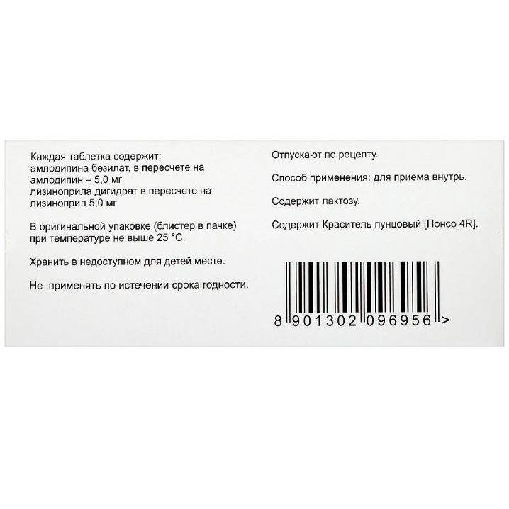 Действующие вещества: амлодипина безилат (в пересчете на амлодипин) 5, 000 мг; лизиноприла дигидрат в пересчете на лизиноприл 5, 000 мг,