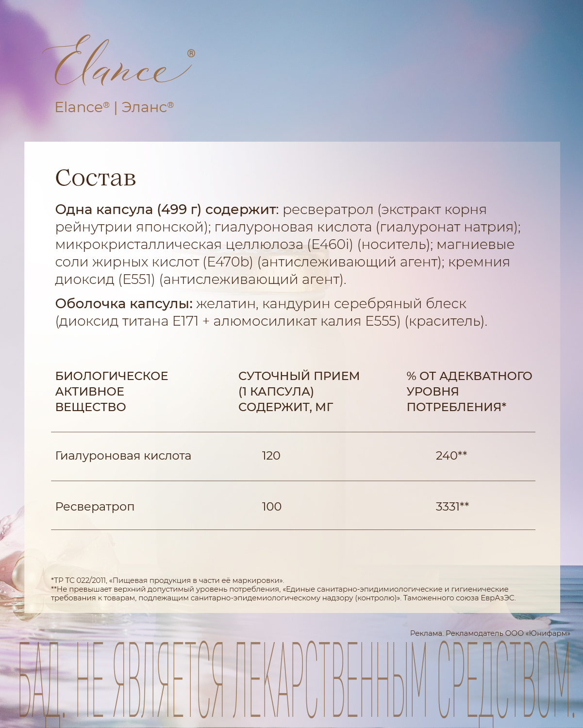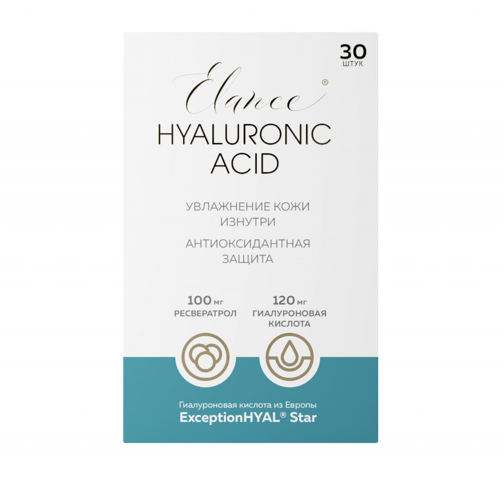 Свойства БАД Эланс® Гиалуроновая кислота обуслов- лены действием гиалуроновой кислоты и ресвератрола, которые способствуют:
