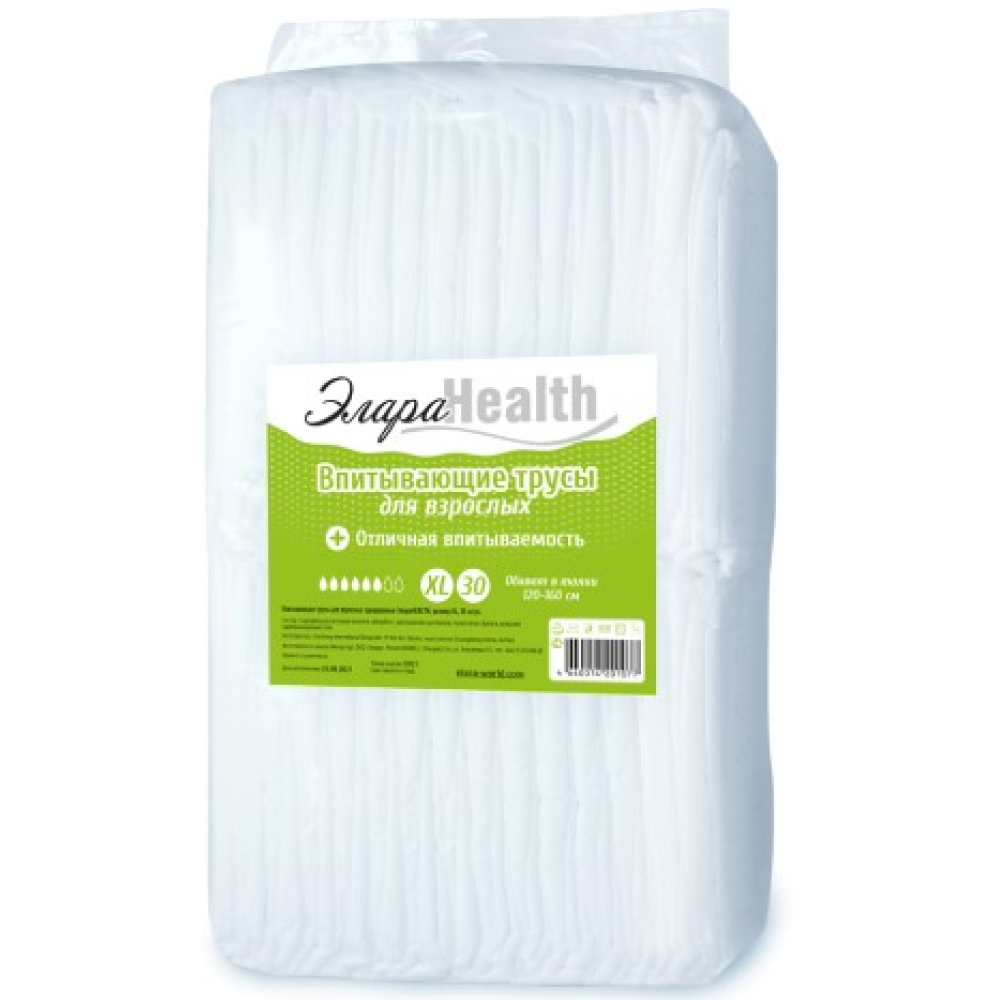 Впитывающие трусы для взрослых ЭлараHealth размер XL, 30 шт, обхват талии и бедер 120-160 см. Подгузники трусики для взрослых отличаются тем, что их можно надевать и снимать как обычное бельё. Поэтому они лучше подходят для людей, ведущих активный образ жизни. Подгузники-трусики более тонкие чем обычные подгузники для взрослых, за счёт чего не заметны под одеждой. Памперсы для взрослых имеют впитывающий слой быстро поглощающий влагу и надежно удерживающий её внутри, сохраняя сухость и комфорт. Боковые швы разрываются, позволяя легко и быстро менять трусики. Суперабсорбент отлично впитывает и удерживает запахи. Трусы подгузники для взрослых отлично подойдут для людей с ограниченными двигательными возможностями, столкнувшимися с недержанием мочи. Преимуществами данных подгузников-трусиков является высокая впитываемость, увеличенные боковые внутренние бортики препятствующие протеканию и мягкий эластичный пояс для лучшего комфорта.