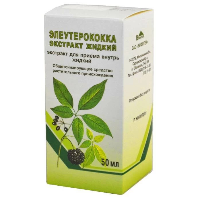 Активное вещество: жидкий экстракт корневищ с корнями элеутерококка (1 кг растительного сырья на 1 л экстракта) - 50 мл.