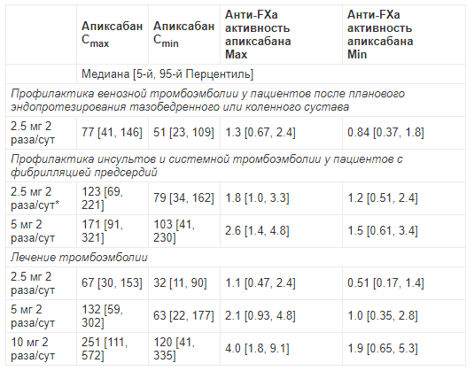 В таблице 2 показаны предполагаемые равновесные концентрации и анти-FXa активность при применении препарата апиксабан по каждому из показаний. У пациентов, получающих апиксабан после планового эндопротезирования тазобедренного или коленного сустава, отношение максимального и минимального уровня анти-FXа активности в интервале между приемом доз препарата не превышает 1.6. У пациентов, получающих апиксабан по поводу профилактики инсульта и системной тромбоэмболии при неклапанной фибрилляции предсердий, данное отношение составляет менее 1.7, а у пациентов, получающих апиксабан по поводу лечения тромбоза глубоких вен и профилактики рецидивов тромбозов глубоких вен - менее 2.2.