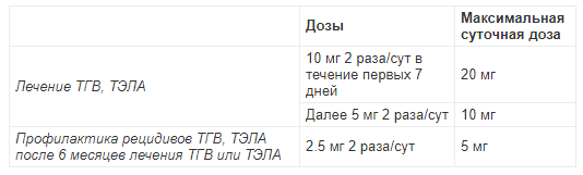Лечение ТГВ и ТЭЛА: по 10 мг 2 раза/сут в течение 7 дней, затем 5 мг 2 раза/сут. Продолжительность лечения определяется индивидуально с учетом соотношения ожидаемой пользы и риска возникновения клинически значимых кровотечений. Решение о длительности терапии должно основываться на оценке наличия и обратимости факторов, предрасполагающих к рецидивированию (т.е. предшествующее хирургическое вмешательство, травма, период иммобилизации и т.д.), а также проявлений ТГВ и/или ТЭЛА, составляя, как минимум, 3 месяца.