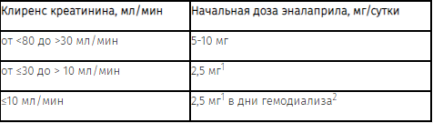 Прием диуретиков следует прекратить за 2-3 дня до начала терапии эналаприлом. Если это невозможно, то начальную дозу эналаприла следует снизить (до 5 мг или менее1) для определения первичного эффекта на АД. Далее дозу следует подбирать с учетом потребности и состояния пациента.