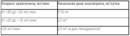 Прием диуретиков следует прекратить за 2-3 дня до начала терапии эналаприлом. Если это невозможно, то начальную дозу эналаприла следует снизить (до 5 мг или менее1) для определения первичного эффекта на АД. Далее дозу следует подбирать с учетом потребности и состояния пациента.