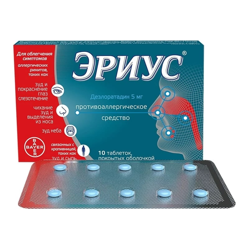 Препарат Эриус® применяется у взрослых и детей старше 12 лет при аллергическом рините (устранении или облегчении чихания, заложенности носа, выделения слизи из носа, зуда в носу, зуда неба, зуда и покраснения глаз, слезотечения); крапивнице (уменьшении или устранении кожного зуда, сыпи).
