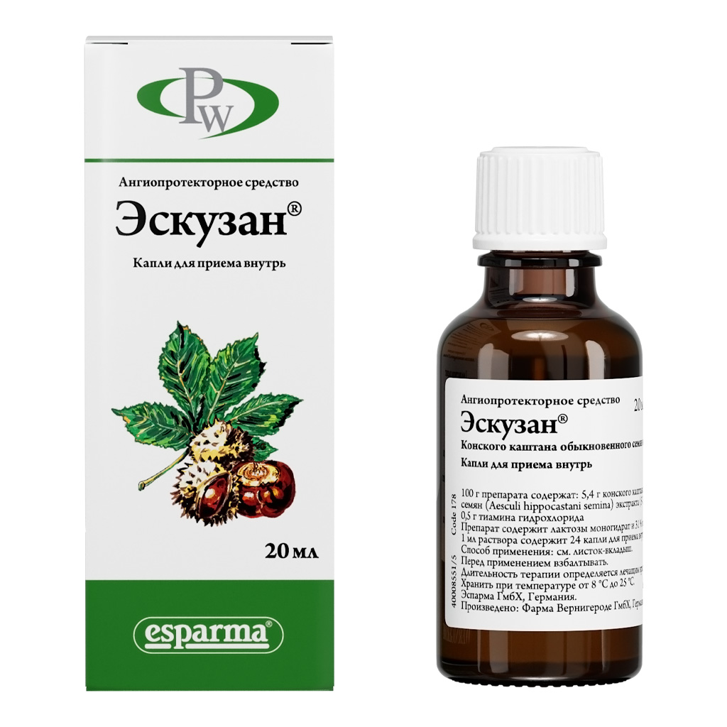 Препарат, применяемый при нарушениях венозного кровообращения. Содержит экстракт плодов конского каштана, оказывает антиэкссудативное, венотонизирующее действие. Установлено, что экстракт плодов конского каштана уменьшает концентрацию лизосомальных энзимов, в результате этого снижается распад мукополисахаридов в области стенок капилляров. Эскузан снижает проницаемость сосудов, предотвращая фильтрацию низкомолекулярных протеинов, электролитов и воды в межклеточное пространство. В рандомизированных двойных слепых и перекрестных исследованиях отмечалось снижение транскапиллярной фильтрации и значительное уменьшение отеков, уменьшение чувства тяжести, усталости, напряженности, зуда, боли.