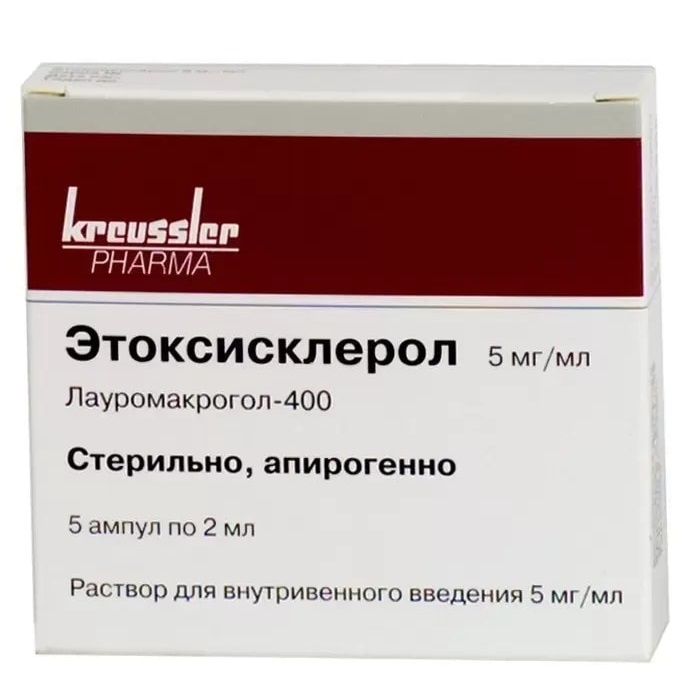 Этоксисклерол в виде раствора 10 мг/мл - для склерозирования центральных вен телеангиэктазий, ретикулярного варикоза и мелких варикозных вен (подкожные вены).