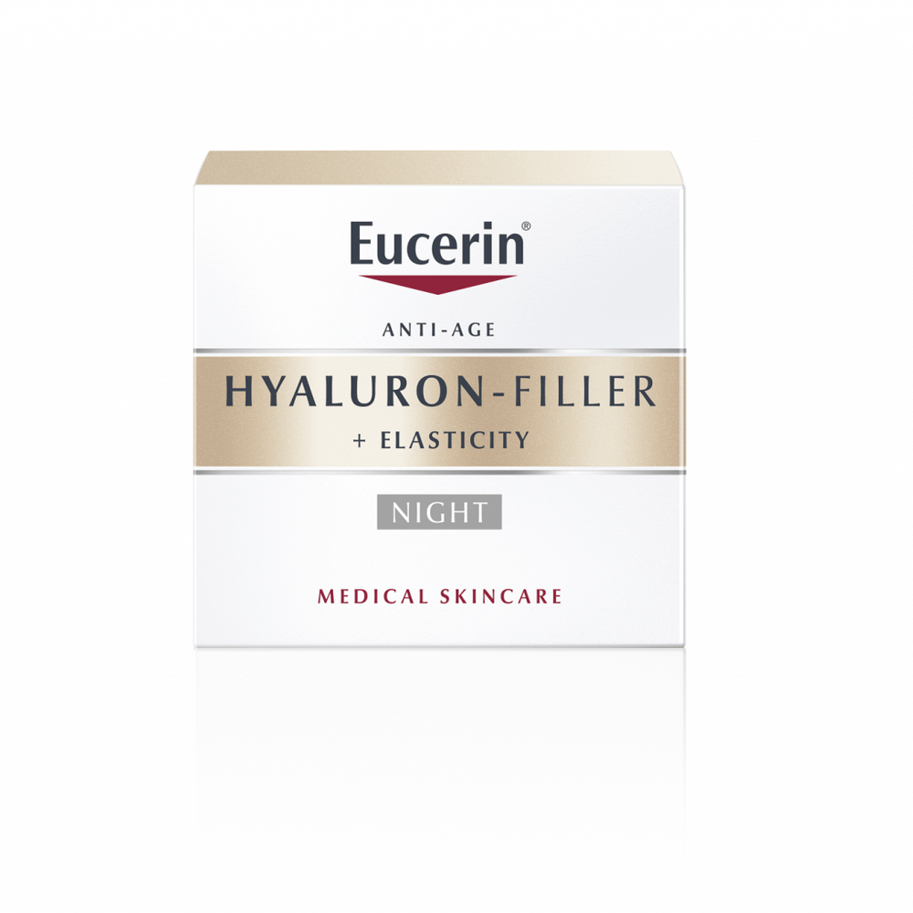 Eucerin HYALURON-FILLER + ELASTICITY — ночной крем для молодости кожи, который разглаживает глубокие морщины и улучшает эластичность кожи.