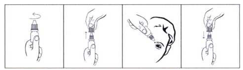 3. Запрокинуть голову назад, расположить наконечник флакона над глазом и указательным пальцем другой руки оттянуть нижнее веко вниз. Слегка надавить на флакон и закапать необходимое количество препарата в конъюнктивальный мешок глаза.