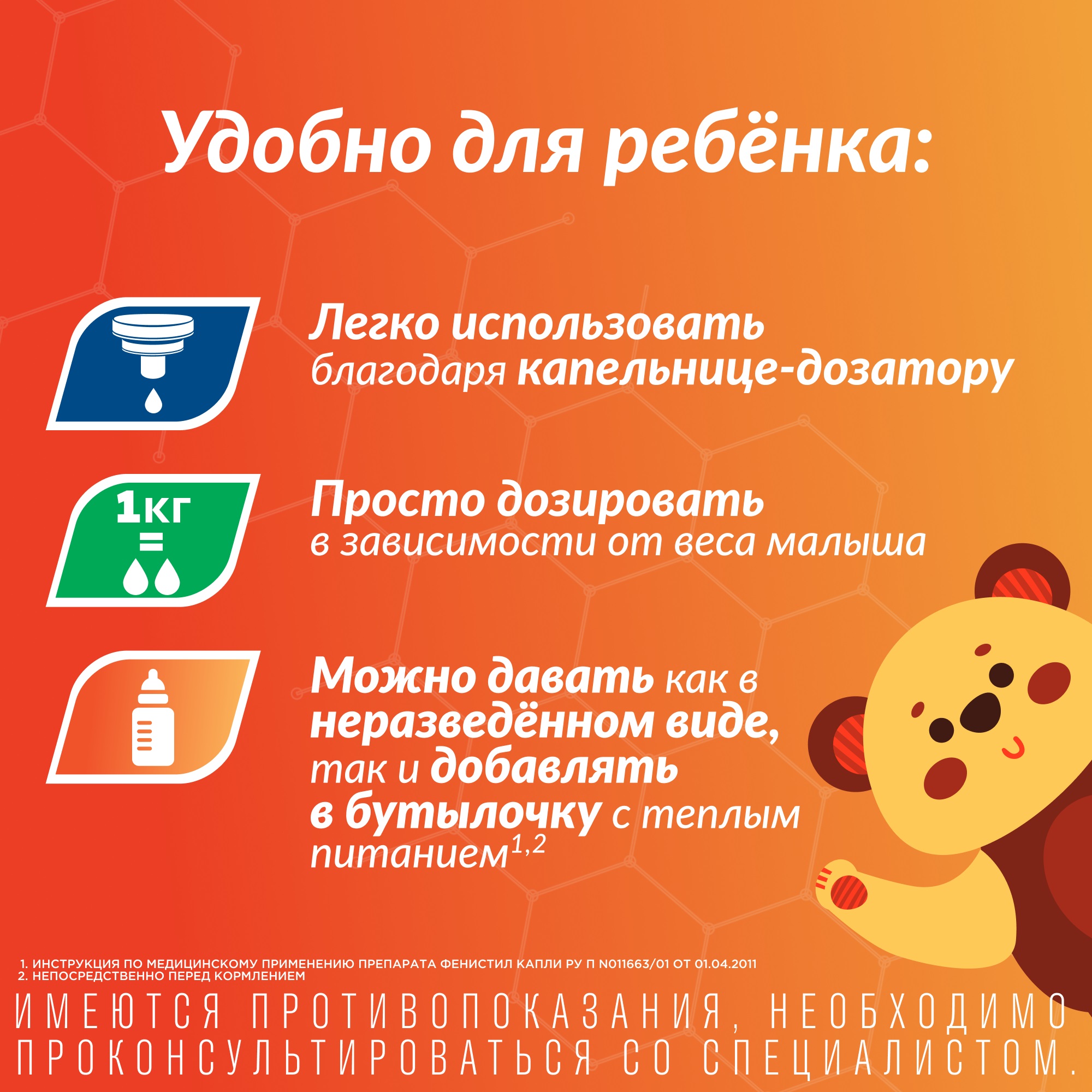 При назначении грудным детям их следует добавлять в бутылочку с теплым детским питанием непосредственно перед кормлением. Если ребенка уже кормят с ложки, капли можно давать неразведенными. Капли имеют приятный вкус.