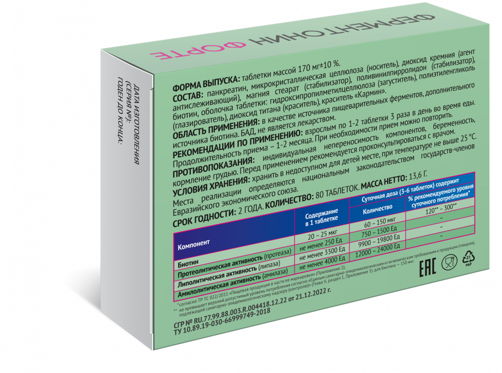 Панкреатин, микрокристаллическая целлюлоза (носитель), диоксид кремния (агент антислеживающий), магния стеарат (стабилизатор), поливинилпирролидон (стабилизатор), биотин, оболочка таблетки: гидроксипропилметилцеллюлоза (загуститель), полиэтиленгликоль (глазирователь), диоксид титана (краситель), краситель «Кармин».